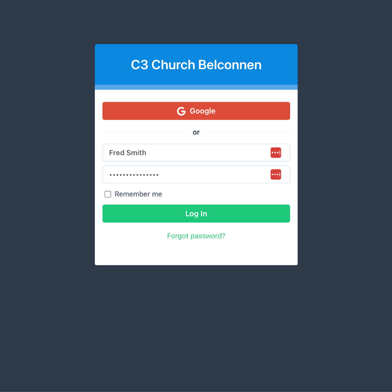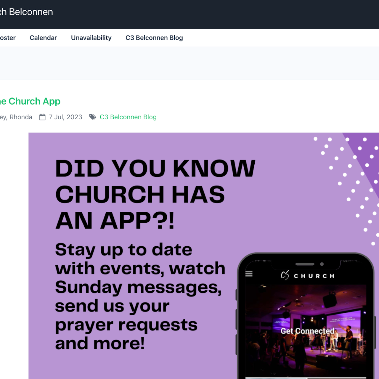 Log in to Elvanto using the log-in details provided to you by the office. If you do not have log-in details or have troubles reach out the office at office@c3belconnen.org.au or 6253 5111
